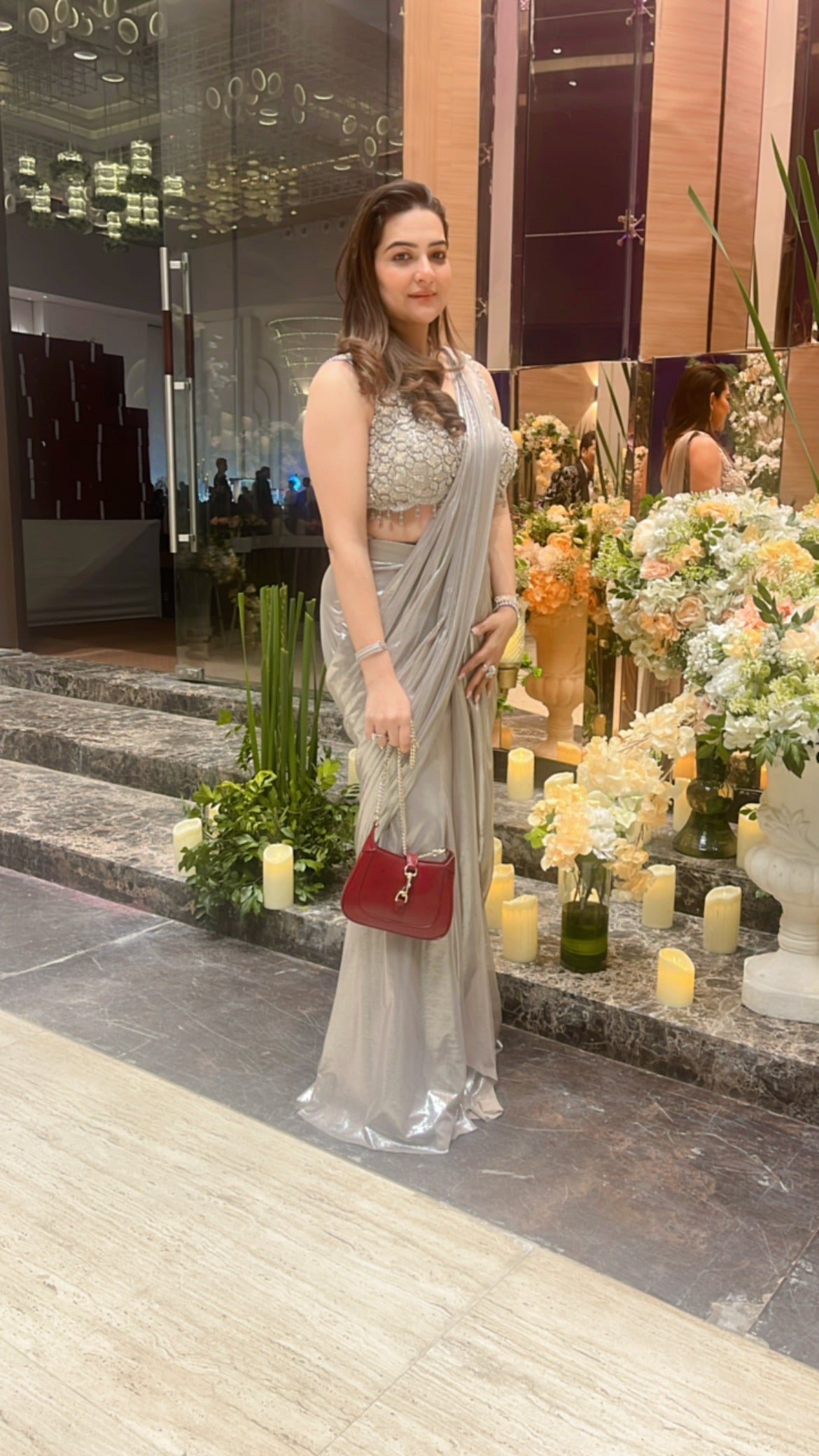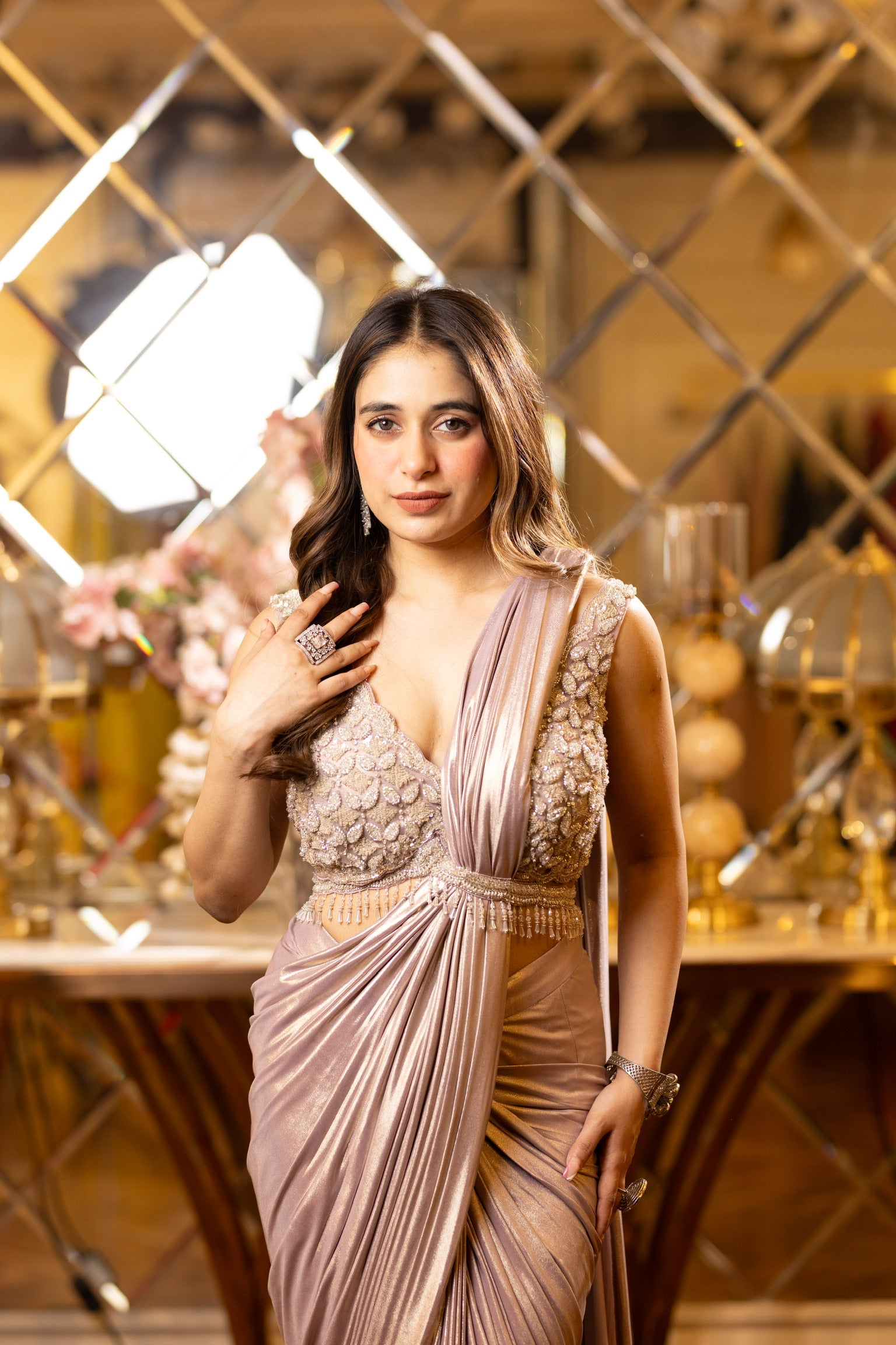 This rose-gold metallic pre-draped saree features fluid sculpted pleats that hug the silhouette, paired with a hand-embellished pearl and sequin blouse that adds richness and texture. The soft shimmer of the drape combined with intricate detailing makes this ensemble the perfect blend of modern finesse and couture craftsmanship.